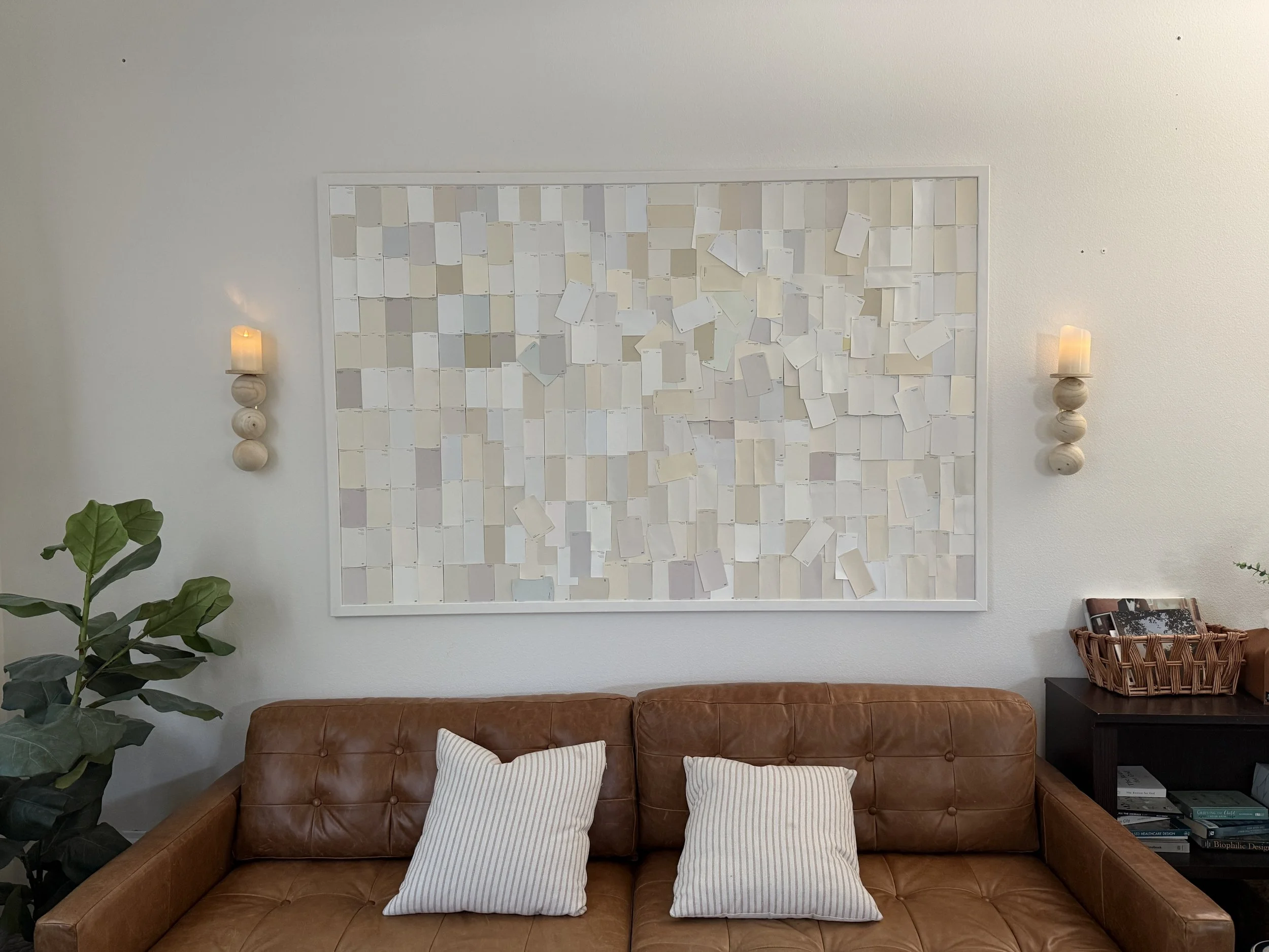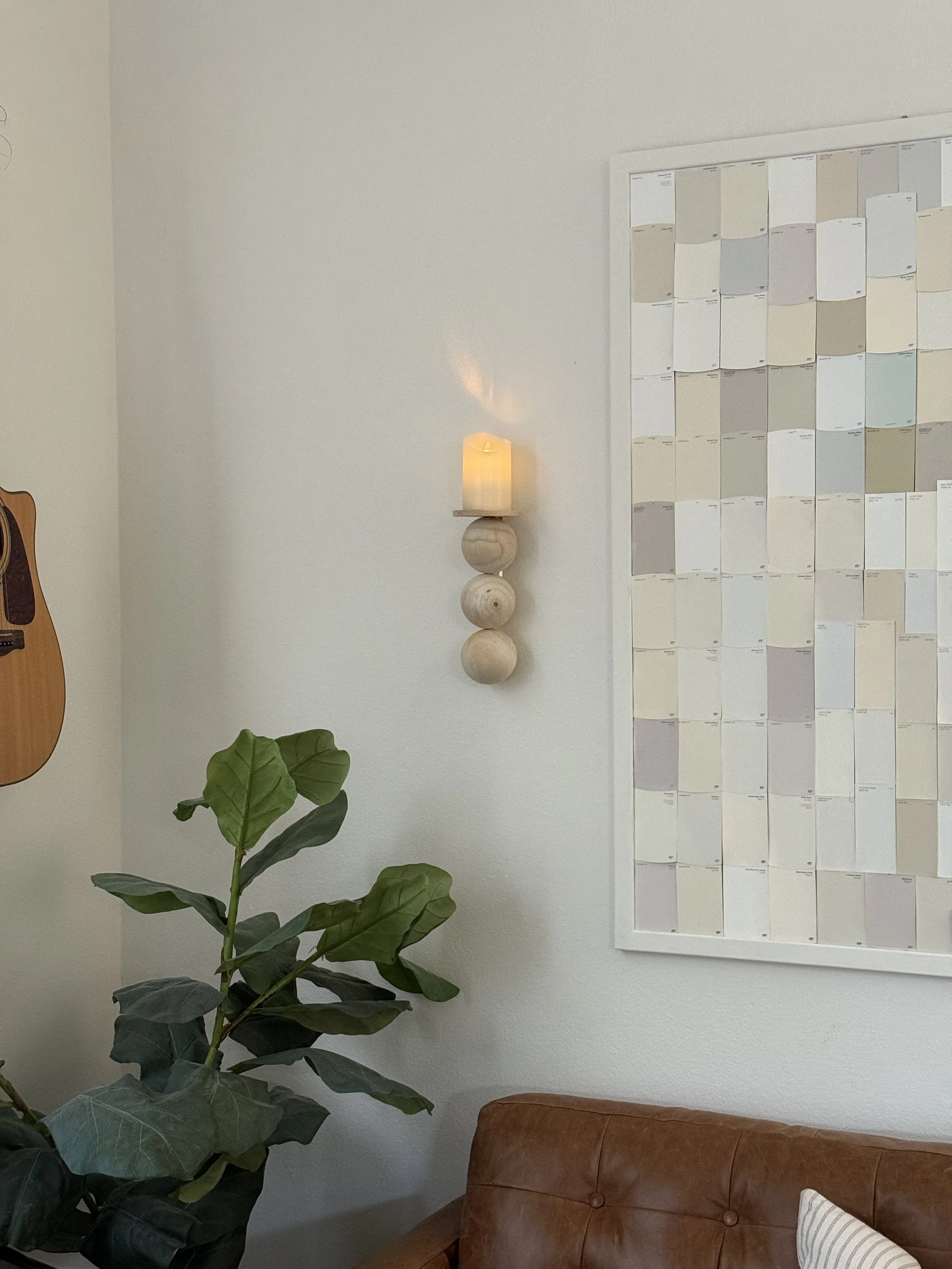 I’d been searching for the perfect soft, modern, natural feeling sconces to frame this giant living room wall art I hung a couple months ago. I originally thought I’d go with battery bulbs, but I just couldn’t find the right sconce that would work with them, especially since most spherical lights (which I love for this spot) have lamp shades that are really difficult to remove, and battery bulbs would require removing them frequently to charge them.